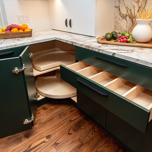 Notable elements can be found throughout this modern remodeled Urbandale home. In the kitchen, chrome metal cabinet doors frame the grain-matched porcelain stove hood and backsplash, while the Essex Green painted custom cabinets call for a double-take. The fridge and freezer are hidden by cabinet-style door panels for an integrated look. The center island, finished with walnut cabinetry, is simple perfection.